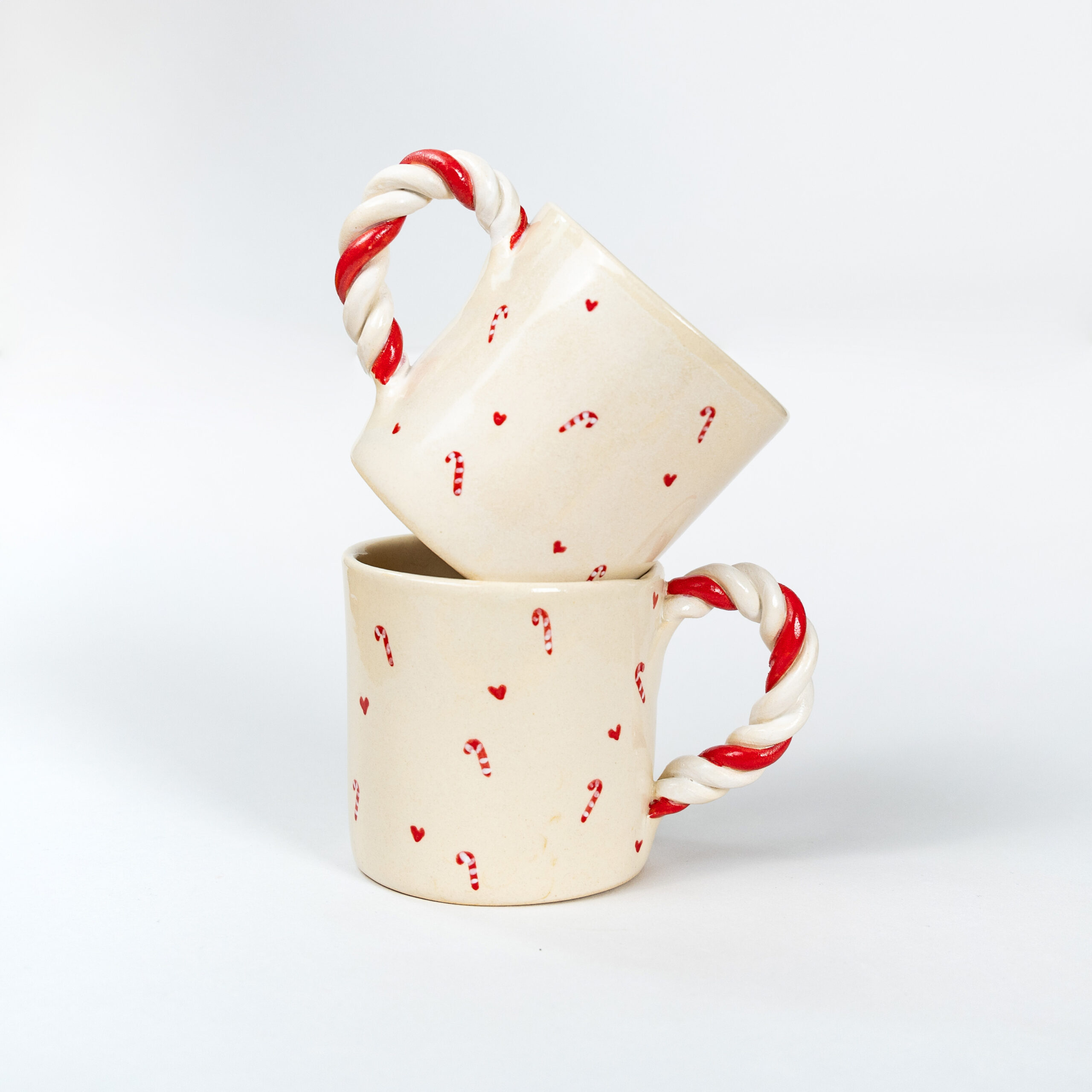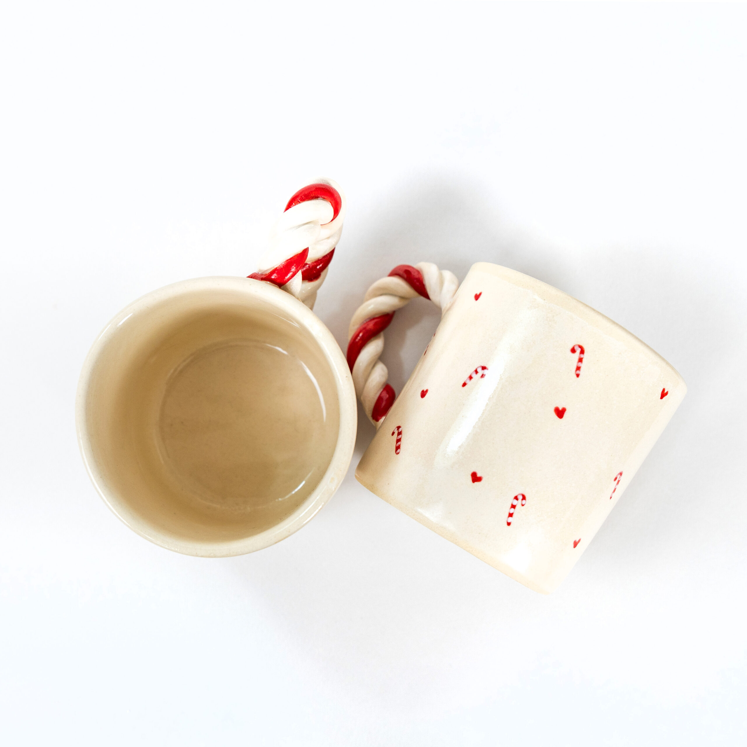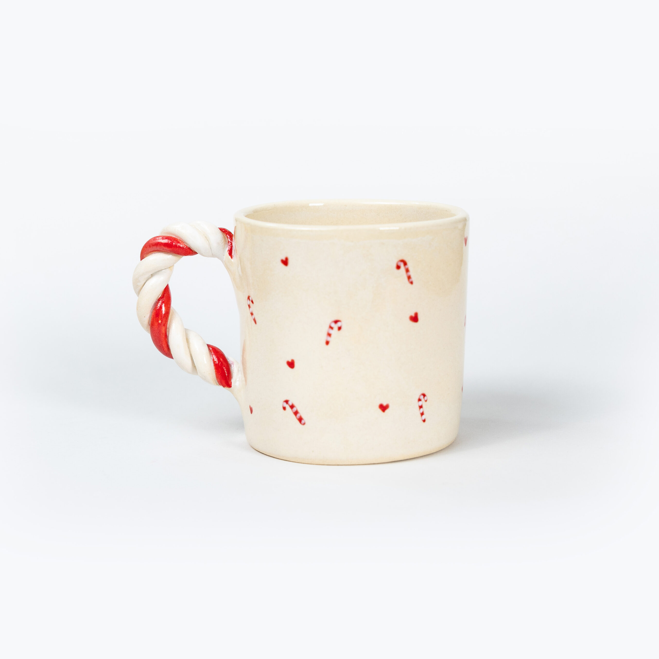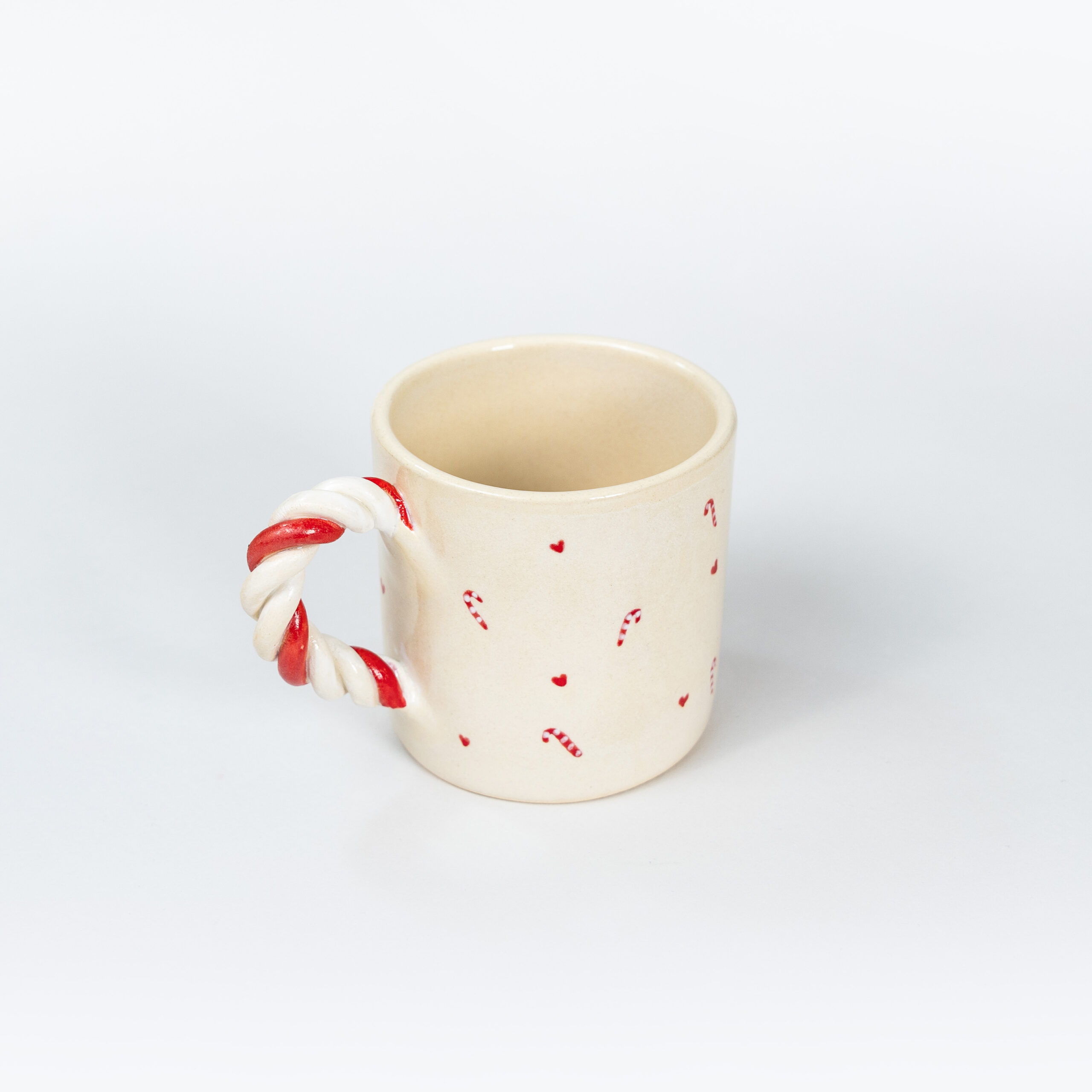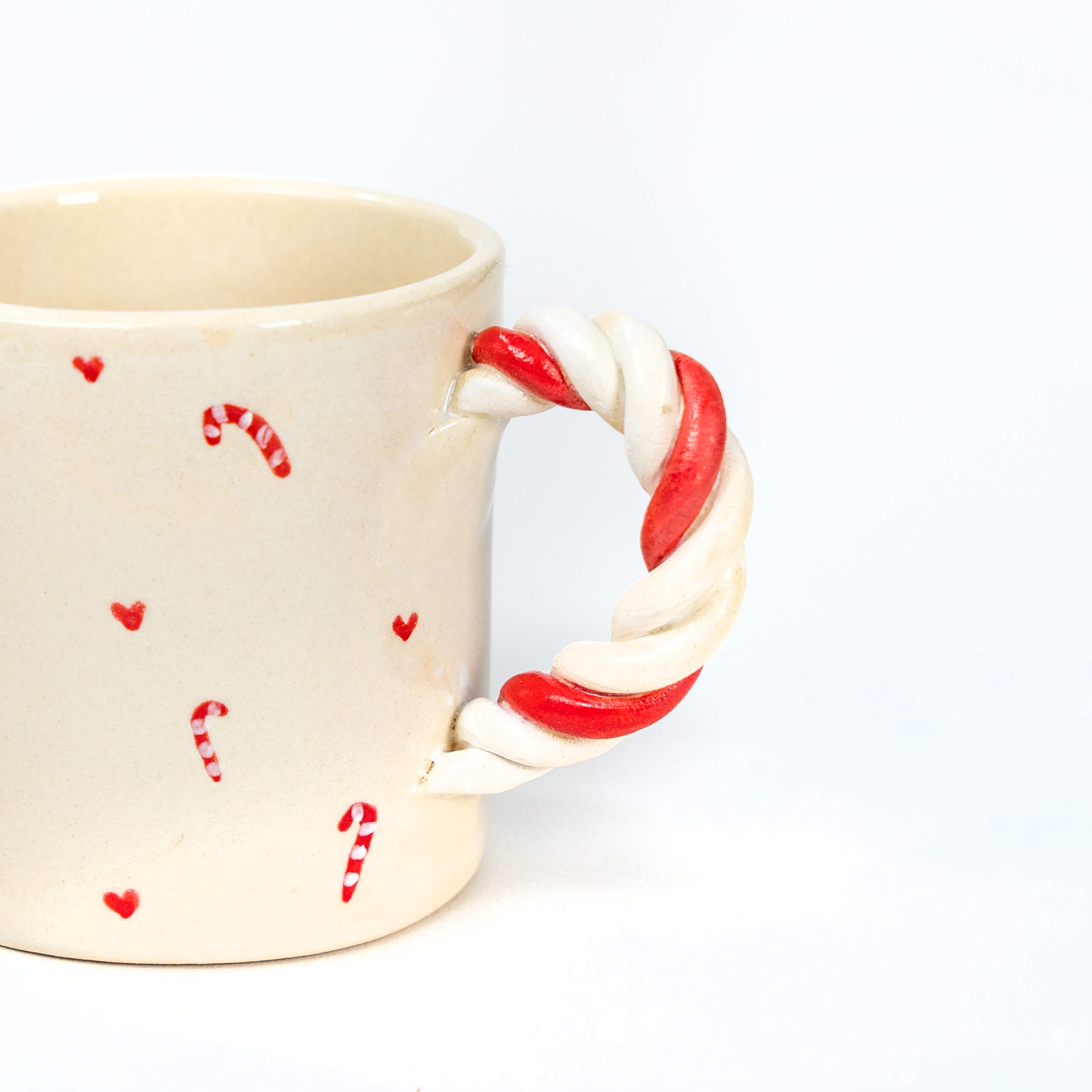 Χειροποίητη κεραμική κούπα “Candy Cane Mug” με χερούλι από πηλό stoneware, χριστουγεννιάτικα σχεδιάκια, γυαλωμένη διαφανή. Ψήνεται στους 1270°C και είναι ασφαλής για τρόφιμα και ποτά. Ιδανική για μεγάλες ποσότητες καφέ.