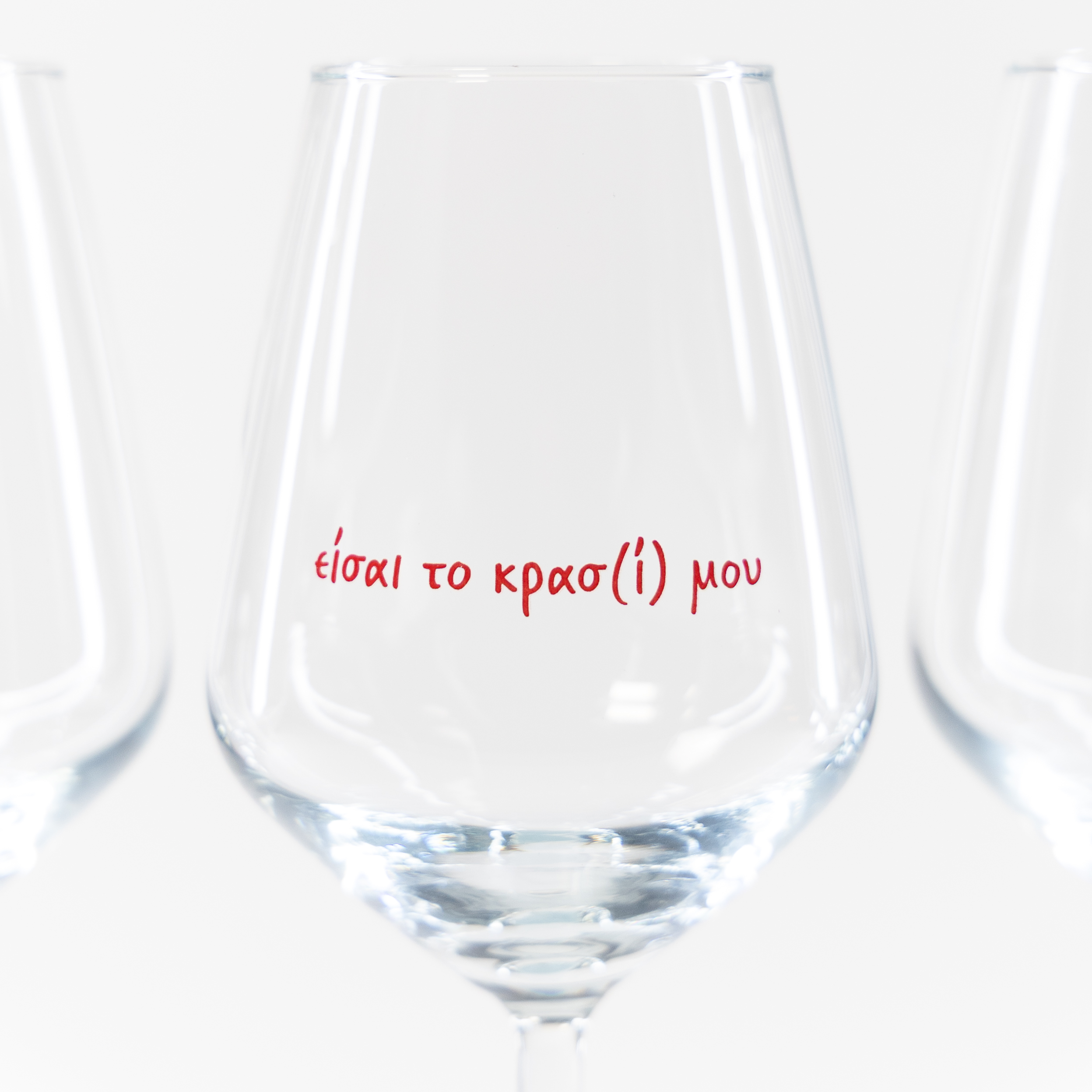 Γυάλινο ποτήρι κρασιού εξαιρετικής ποιότητας, με τύπωμα της φράσης «είσαι το κρασ(ί) μου» σε κόκκινα γράμματα. Έχει παραχθεί στην Ελλάδα με έμφαση στη λεπτομέρεια και είναι κατάλληλο για κατανάλωση ποτού.